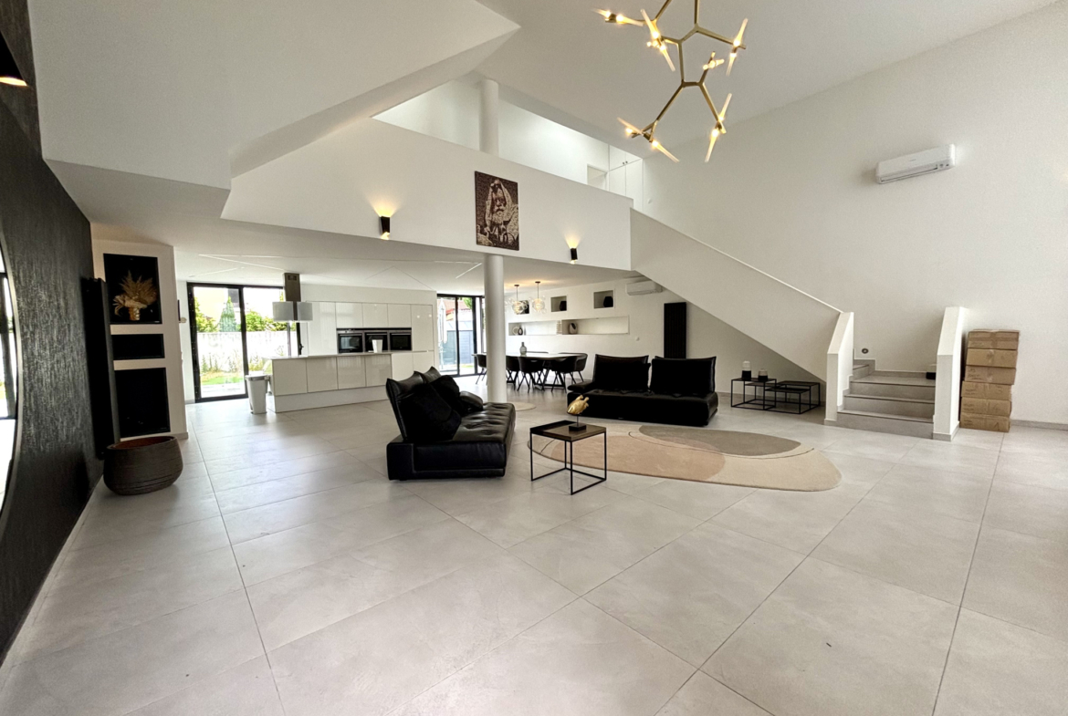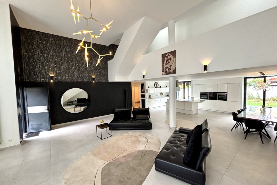 Dès l’entrée, vous serez immédiatement séduit par une pièce de vie exceptionnelle, sublimée par une magnifique hauteur sous plafond et des volumes spectaculaires baignés de lumière. Cet espace s’ouvre sur une superbe cuisine ouverte, entièrement équipée, pensée avec des matériaux de qualité et des finitions haut de gamme — un lieu de réception aussi élégant que convivial.